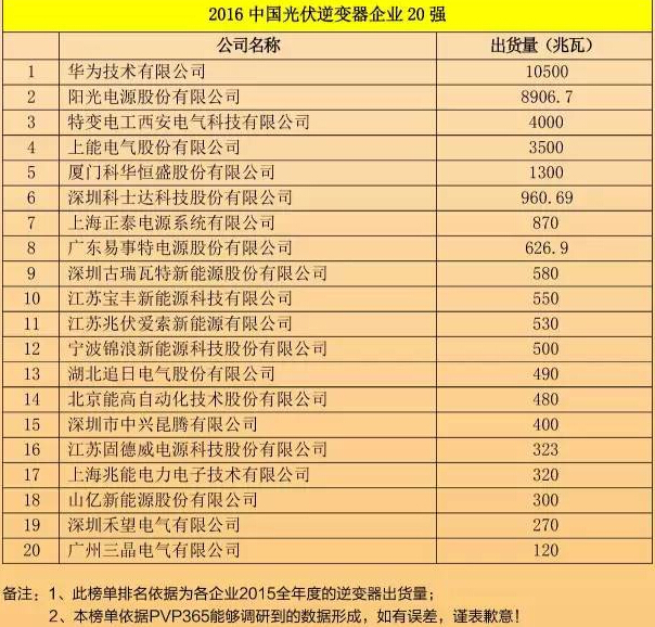 2016年中國光伏逆變器最新排名榜單