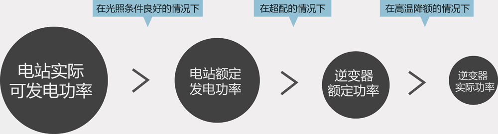 問題又來了,通常中午也是一天氣溫最高的時候,逆變器工作環(huán)境溫度高,再加上部分廠家逆變器自身散熱差,導(dǎo)致了逆變器的降額。從6月份大同“領(lǐng)跑者”基地并網(wǎng)數(shù)據(jù)來看,很多業(yè)主發(fā)現(xiàn),在日照條件非常好的時候,其發(fā)電系統(tǒng)發(fā)電量反而下降。這是業(yè)主方始料未及的,出現(xiàn)這一問題的原因就是逆變器的高溫降額。下圖可以清晰說明,在光照條件良好的情況下,電站的發(fā)電系統(tǒng)發(fā)電功率是大于電站設(shè)計的額定功率的,但是在超配的情況下,逆變器的功率是小于電站額定功率的,而恰恰這個時候逆變器出現(xiàn)了高溫降額。發(fā)電效率成幾何倍數(shù)的降低,導(dǎo)致業(yè)主直接經(jīng)濟(jì)利益損失。所以部分逆變器生產(chǎn)廠家不注明具體環(huán)境溫度,來宣傳產(chǎn)品的過載能力,就是在偷換概念。
